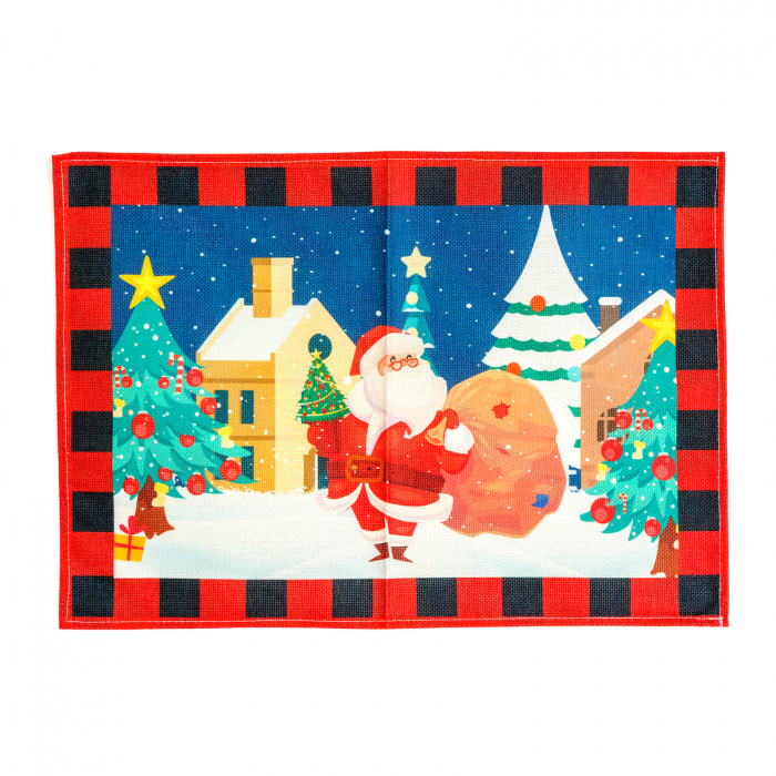 Adauga un plus de culoare si veselie mesei tale festive cu acest suport de farfurie decorativ, decorat cu imaginea lui Mosul si a bradului. Realizat în stil nordic, cu model în carouri rosu-negru, suportul protejeaza fata de masa si completeaza perfect decorul de sezon.
