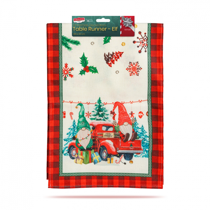 Transforma masa ta într-un punct de atractie cu aceasta traversa decorativa de masa în stil modern, cu model spiridus! Tesatura în carouri rosu-negru, completata de imprimeul vesel cu spiridusi si masinuta, aduce o atmosfera calda si jucausa în orice încapere.