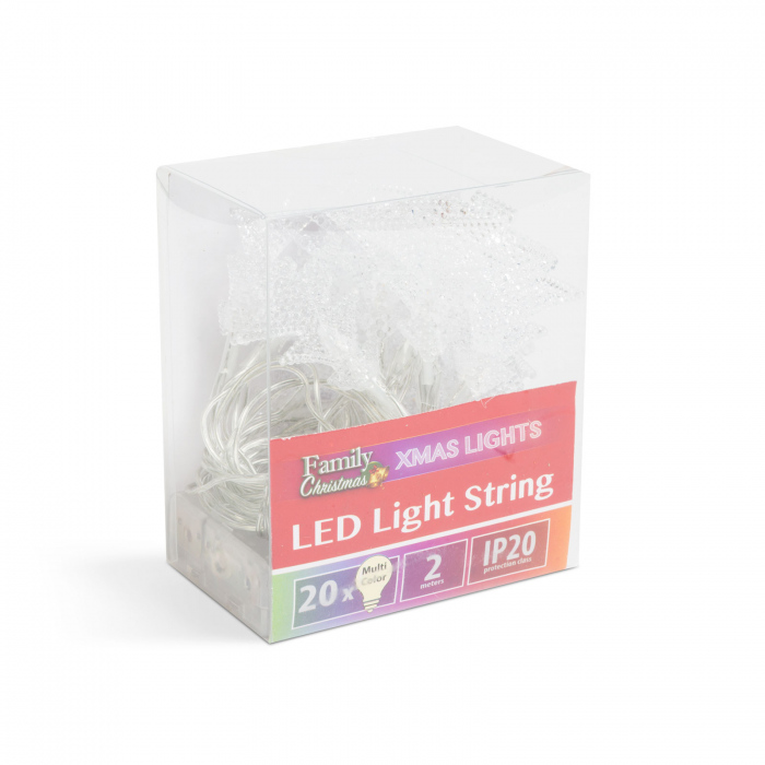 Decoreaza-ti casa cu mici siruri de lumina LED cu pini! Pinii sunt luminati de LED-uri colorate, oferind casei dvs. o experienta vizuala minunata din toate directiile. Poate fi ideal pentru decorarea pomilor de Craciun, ghirlande, rafturi, coroane, perdele. Datorita consumului redus de energie al sursei de lumina LED, acesta poate fi actionat cu o baterie pentru o lunga perioada de timp. Tehnologie LED Sir luminos colorat Functionarea bateriei Nu necesita curent electric, poate fi amplasat oriunde Nu se încalzeste, este sigur Cu cablu transparent, subtire PORNIT / OPRIT Dimensiunea matritei: 40 mm Sursa de lumina: LED Numar de LED-uri: 20 buc Distanta LED-urilor: 10 cm Culoare LED: Culoare Sursa de alimentare: 3 baterii AA 1,5V (nu sunt incluse) Lungimea sectiunii de iluminare: ~ 2 m Lungimea cablului la suportul bateriei: 30 cm