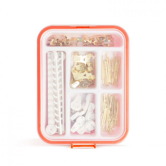 Elementul de baza pentru decorarea casei dvs. constituie decorarea peretilor cu fotografii si tablouri, la care este posibil sa aveti nevoie de mai multe accesorii pentru fixare. În acest set veti gasi cu siguranta piesele necesare. Pachetul include agatatoare pentru pereti de beton, cârlige simple, cârlige duble si simple, cuie si alte dispozitive de fixare. Caseta cu capac transparent ofera vizibilitate perfecta asupra continutului.