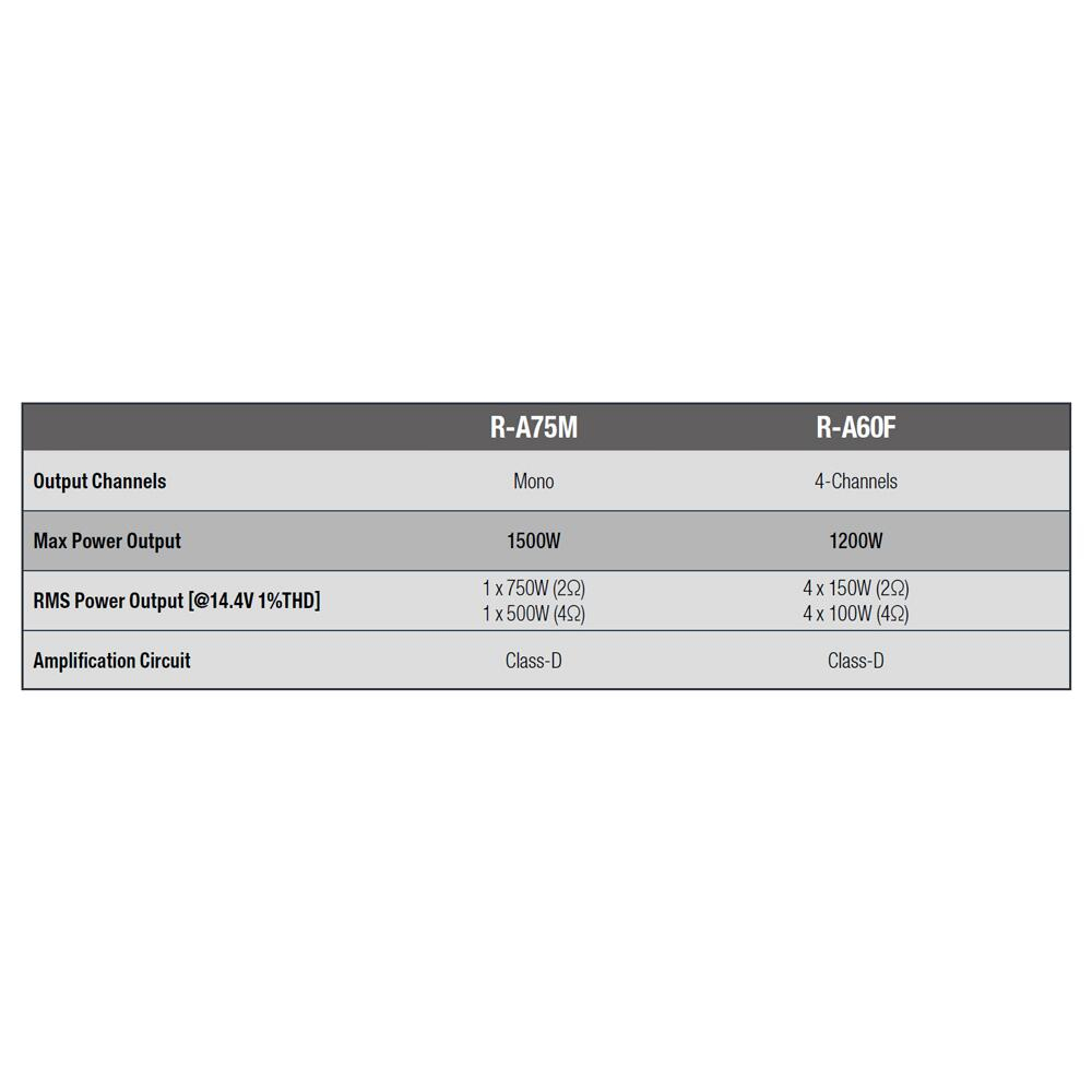 Compact și puternic: noul amplificator digital permite o putere de ieșire ridicată, păstrând în același timp o amprentă mică. R-A75M măsoară doar 274 mm lățime x 223 mm lungime pentru o instalare ușoară în aproape orice vehicul.