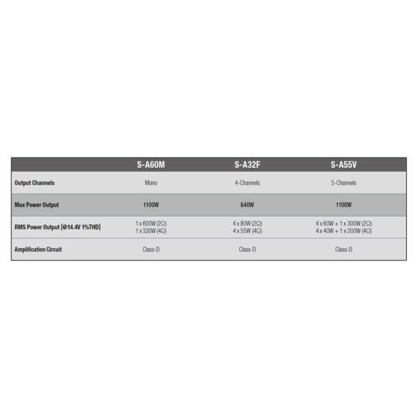 Amplificatoarele din seria S sunt disponibile în configurație mono, pe 4 și 5 canale.