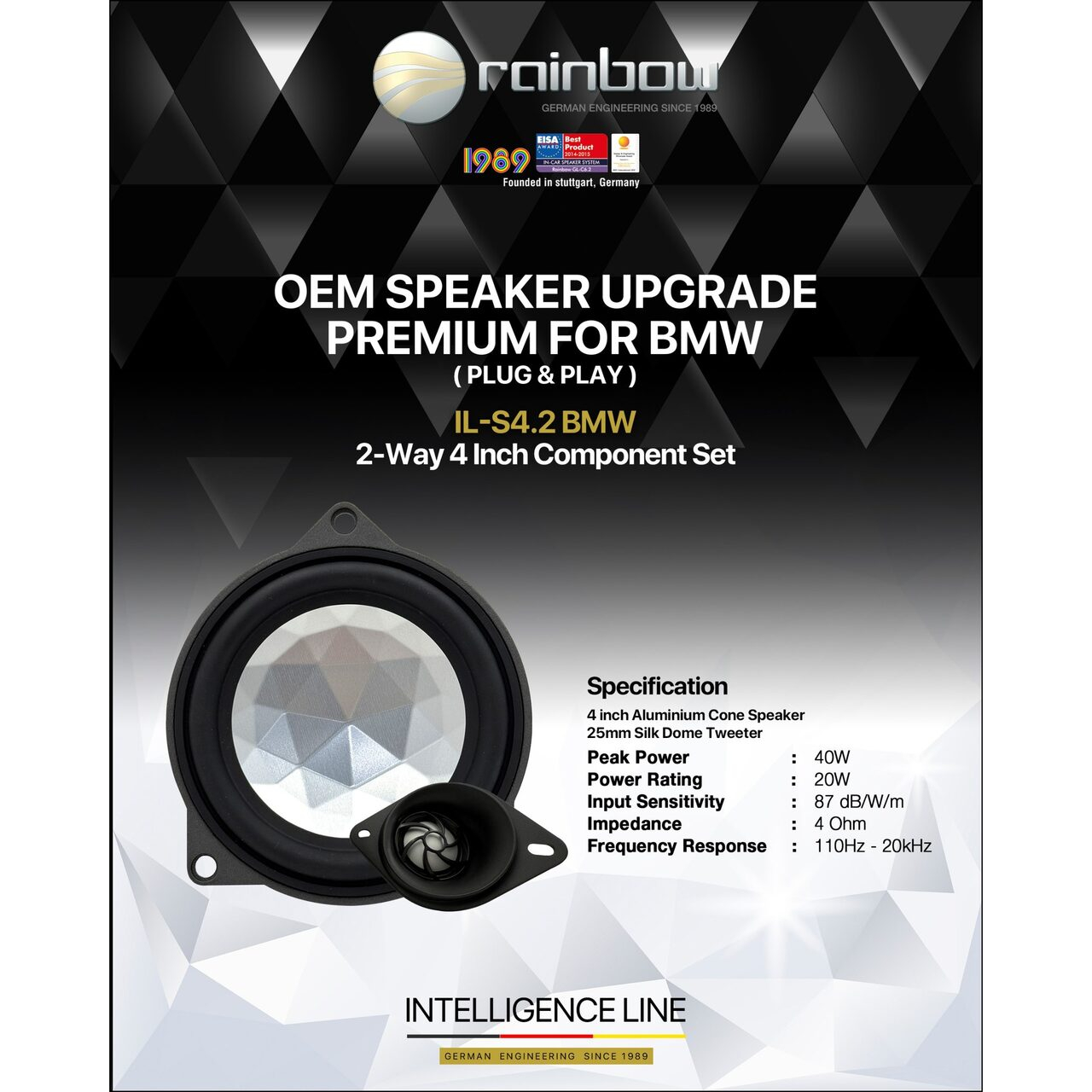 Sistem de difuzoare componente Rainbow de 10cm (4") pentru BMW, instalare tip Plug'n'Play, putere 20/40W, Seria Intelligence