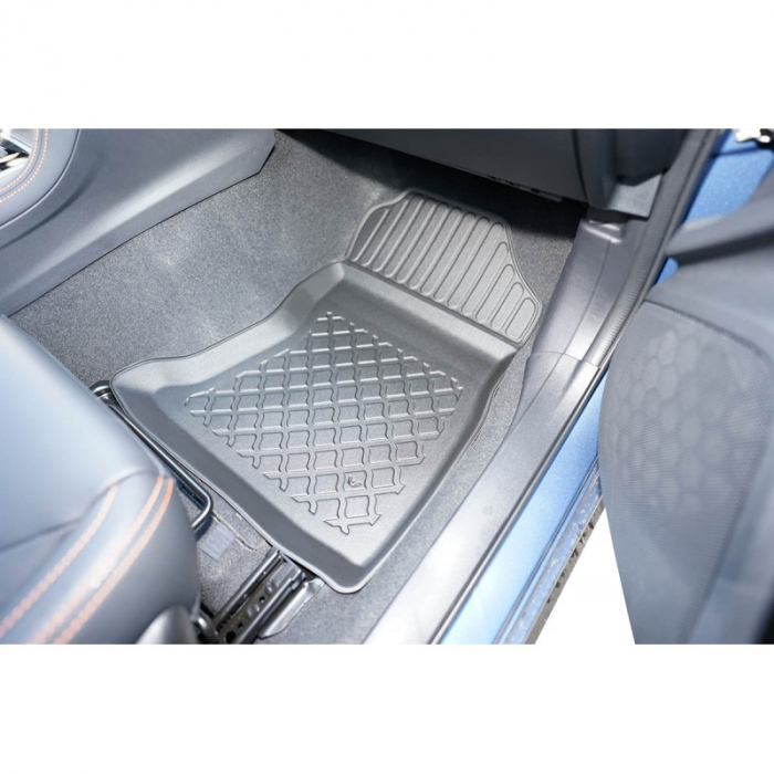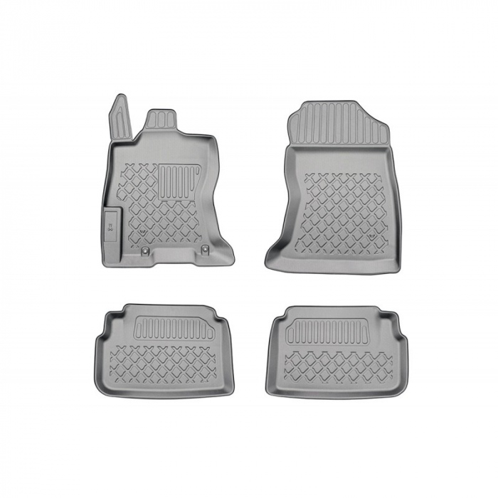 Materialul covoraselor gen tavita cu margini inalte pentru Subaru XV e-Boxer nu este cauciuc obisnuit, ci un cauciuc artificial intarit, un polimer (reinforced thermoplastic elastomer) care combina avantajele cauciucului cu cele ale plasticului de inalta rezistenta si durabilitate. Este similar celui din care sunt produse tavitele pentru portbagaj Premium Cool Liner™. Covorasele nu au miros neplacut, sunt foarte usoare, au aspect mat, elegant, incaltamintea nu aluneca pe ele si sunt foarte usor de curatat.