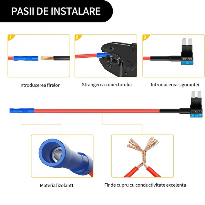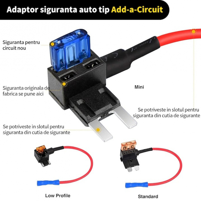 Pentru a conecta circuitul suplimentar, se inlocuieste siguranta auto existenta cu fisa de curent, astfel incat sa se pastreze circuitul initial cu siguranta proprie si sa se adauge un circuit suplimentar. Prin conectarea la acest circuit suplimentar, se poate alimenta o camera auto/dash cam sau orice alt dispozitiv auto care functioneaza la tensiunea furnizata de autovehicul.