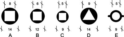 Capăt specializat pătrat 5 mm (C), pătrat 6 mm (B), pătrat 8 mm (A) cu soclu adâncit pt. capete de ÅŸurubelniţă 1/4", rotund 9 mm (E), triunghi 9 mm (D)
