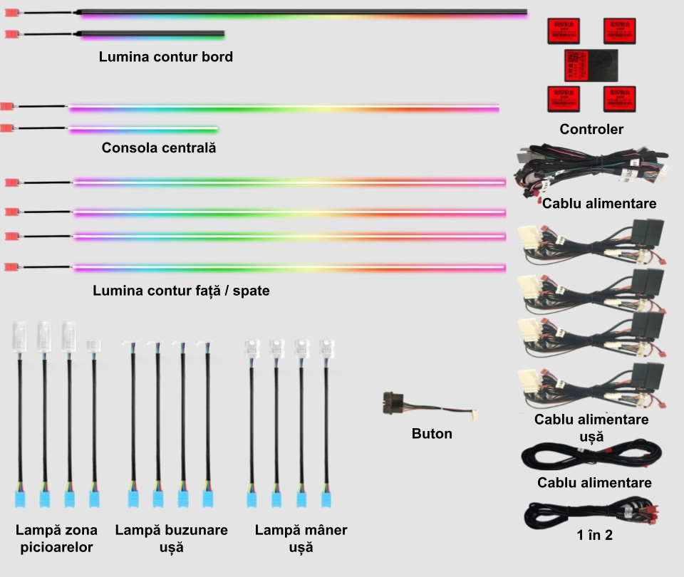 Kitul LED RGB pentru iluminare ambientală auto include 19 piese: 1 controler principal și 4 secundare wireless. Benzile acrilice oferă lumină continuă, fără întreruperi. Alimentare 12V, control Bluetooth prin aplicație mobilă. Dispune de moduri multiple de iluminare și compatibilitate universală pentru o instalare simplă și eficientă.