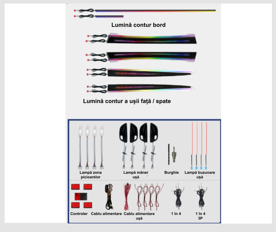 Kitul LED RGB pentru iluminare ambientală auto include 22 piese: 1 controler principal și 4 secundare wireless. Benzile acrilice oferă lumină continuă, fără întreruperi. Alimentare 12V, control Bluetooth prin aplicație mobilă. Dispune de moduri multiple de iluminare și compatibilitate universală pentru o instalare simplă și eficientă.